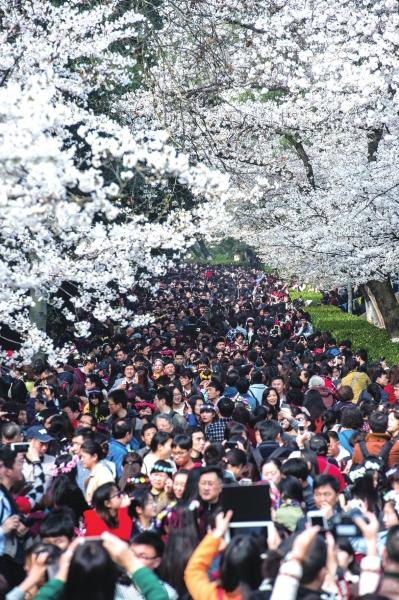 18日は同市内で強い雨が降ったが、桜を楽しみにやってきた観光客たちの情熱には影響を及ぼさなかったようで、同大学のキャンパス内は桜見物の観光客で賑わいを見せた。見物客のなかには、香港や広州、深センなどから評判を聞いてやってきたという人も少なくないという。