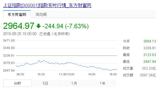 市場全体の値動きを示す上海総合指数は前日比244.94ポイント(7.6%)安の2964.97で取引を終了した。心理的な節目の3000の大台を割り込み、2014年12月下旬以来、約8カ月ぶりの安値を付けた。 ついに「中国経済の減速懸念」ですよ。