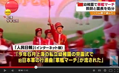 上海市閘北区教育局公式微博(ウェイボー)によると、閘北区教育局は11日午後にインターネット上で反映された上海市震旦外国語幼稚園が2014年6月27日に卒園式で「軍艦行進曲」を流した件を調査し、それを確認した。