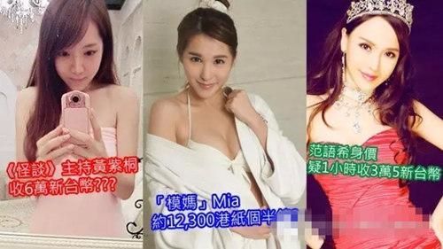 台湾の芸能誌・壱週刊によると、4人は范語希、陳静儀、黄紫桐、何ゲン瞳。セクシー映画「ラン・クワイ・フォン(原題:喜愛夜蒲)」シリーズやテレビ番組などに出演するタレントで、売春料金はそれぞれ3万5000台湾ドル(約13万円)、5万台湾ドル、6万台湾ドル、12万台湾ドル(約45万円)に設定されていた。 TV番組に出るレベルだったらそこそこ名前が売れている単体女優ですよね。