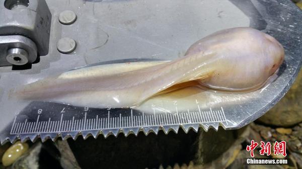 貴州省遵義市の洞穴で14日、体長14センチメートルの巨大オタマジャクシが発見された。